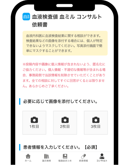 - 当コンサルトでは、患者さんの名前・個人情報はお預かりしません。患部写真・検査値などの画像・問診情報のみをお預かりします。写真に個人を特定できる部位(顔面・指紋など)が入る場合は、不必要な部分を隠した状態でコンサルト依頼をお願いします。なお、運営会社エクスメディオのプライバシーポリシーはこちらをご覧ください。